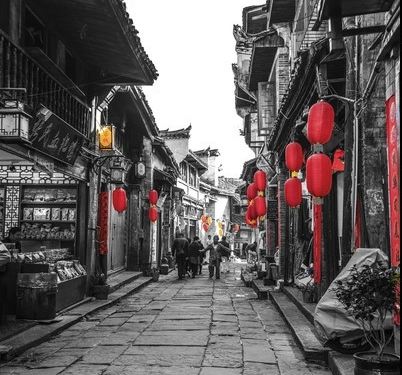 《凤凰县石板老街》石板老街七里长,竖横交叉六朝商。楼阁店铺红灯挂,古往今来集市忙