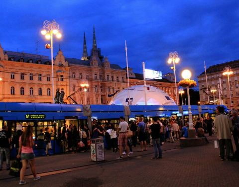 是萨格勒布的中心廣場上 有克罗地亚首任总督耶拉契奇的雕像 广场周围大部分建筑物 都是来源于19世纪 展现了多种建筑风格 如今的廣場已如上海人民廣場 除了是交通樞紐 名店雲集 餐廳林立 也是市民活動的集會所 夜晚燈火通明 很熱鬧~