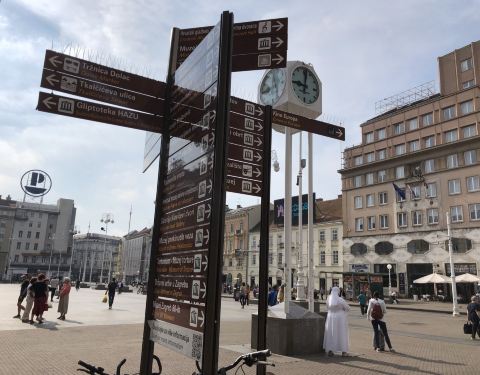萨格勒布市中心,因为那个总督的雕像而得名。 旁边楼上显示屏有时间,变换着萨格勒布的名字,是一个到此一游拍照的好背景。 两侧台阶上去各有不同。一边是大教堂,旅游景点,另一边通往上城区,早起还有花市,...