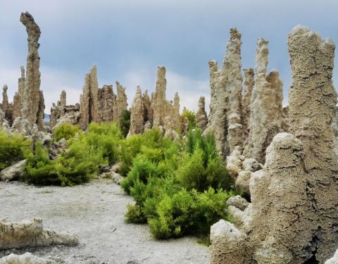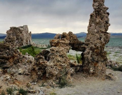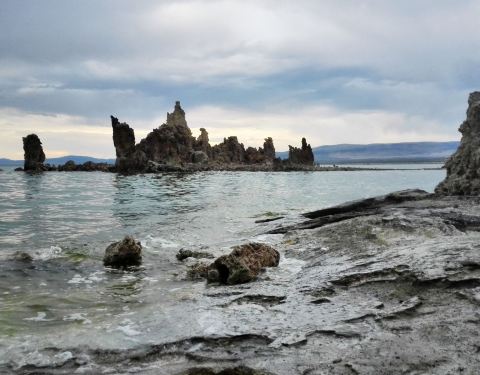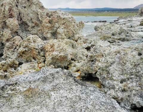 梦露湖(Mono Lake)静卧于群山之中,徒步穿过大片山艾灌木丛来到湖边,只见一大片的石灰岩塔(Tufa)矗立其中,它们在水下生成,经过数百年的生长露出水面并且蚕食湖岸,最终令湖面不断缩小而湖边陆地不断扩展。