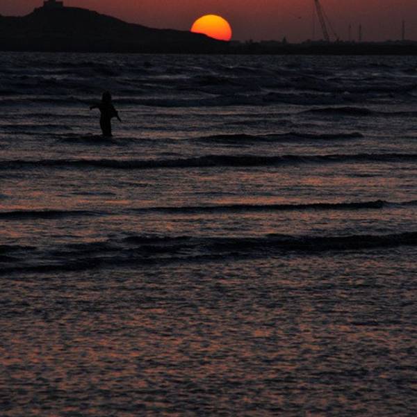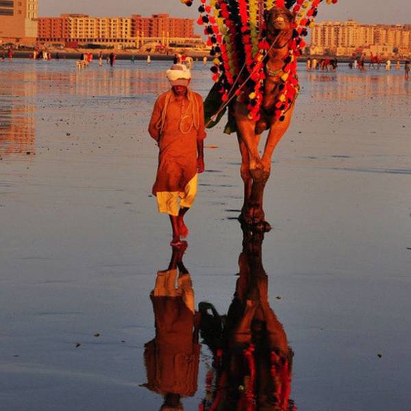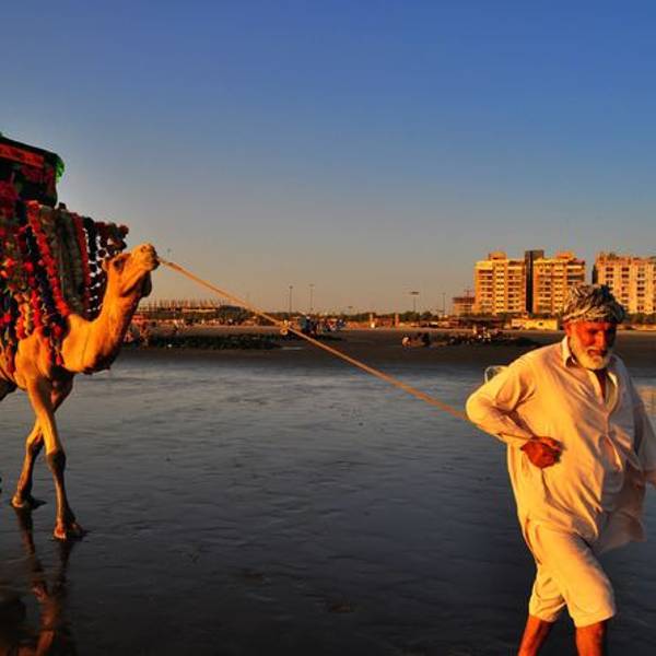 吃好饭苗苗决定先陪我去买回城的车票,经历了昨天一宿地狱一样的火车旅行,打死我也不再坐火车了。这个时候我才想到拉合尔旅馆里那个中国姑娘为什么写千万不要坐火车,可是已经晚了。但错误不能犯两次,而且我也很想尝试一下坐长途班车的感觉。出了餐馆坐上TUTU车,只要说一声DAEWOO,司机就知道我们要去什么地方,车在商业街里穿行,开始感觉到了拥堵,车被夹在商业街里很久才能挪动一段,司机也不着急,只是默默的等着,稍微有空隙便赶紧插上,就这样时走时停好一阵才出了商业街拐进旁边的小街,卡拉奇的城市建设感觉还不如拉合尔,道路两旁全是破房子,一地垃圾,道路也是坑坑洼洼,没一块好路。拐了好几个弯又直着开了一段才到了大宇的客运站,售票窗口上贴着时刻表,去拉瓦品第每天只有一班车,下午四点发车,车程24个小时,票价4300卢比。我没有任何纠结,火车对我来说已经成了噩梦。买好票又咨询了门口的保安说就在这里坐车,提前一个小时到就可以了。出了客运站算着夕阳的时间,坐上TUTU车直奔海滩。司机开始不知道我们要去的地方,我们先和客运站的保安说清楚了再让他用乌尔都语和司机说,司机好像很明白了拉着我们狂奔。往海边走的路越来越好,似乎进了富人区,看到很多独栋的别墅,门口用沙包堆成掩体,高高的塔楼上架着重机枪,我很想拍照,但担心被警卫误当成敌对份子开枪可不是闹着玩的。开了一阵司机停在路边说到了,停下车就伸手朝我们要钱,可我们根本没看到海啊!司机哇啦哇啦说了一大堆我们一句没听懂,实在没办法了就找来附近会英语的人帮我们翻译,交流了很久司机才又明白了似的,继续向太阳落山的方向开去。越向西边开,建筑密度越低,别墅越多,西面的天空也越开阔,我猜测着离海边不远了。转过一个大的转盘路后前方隐约看到了海滩,司机90度转向沿着一大片花园开,然后在花园的边缘找到一条很窄的小路穿进去。出了花园看到了海滩,但海滩上到处都是垃圾,俨然是到了垃圾场,而且又非常荒凉,我有点害怕,抱着相机随时准备跳车和司机做殊死搏斗,在垃圾堆里开了一会司机又转向回到了沿海公路上,朝海边的高楼开去,我这才稍微放心。直到看到海滩上有供游客照相的骆驼我的心才彻底放下来。司机开上海滩后停了下来,张口管我们要400卢比,可我们开始谈好的价格是150卢比,我们付了150卢比就拒绝再付任何钱,司机追着我们要,追了一阵后看到我们态度非常坚决后才怏怏的离开。 这是一片黑褐色的海滩,我想这不会是因为阿拉伯盛产石油的缘故吧?海滩上放着不少座椅供游客赏景,海滩后面是高高的海景酒店,只有在这里才看到卡拉奇繁华的一面,海滩上有不少做小生意的摊贩,还有拉着骆驼揽生意的老人。从来没想过我的足迹会踩在阿拉伯海的海滩上,也从来没想过会跑到距离家乡如此远的地方,心里很激动。苗苗相中了高大的阿拉伯单峰骆驼,20卢比坐一圈,我们反复询问了价格,确定是20卢比苗苗才决定坐一回。我等在下面拍照,也不知道拉骆驼的老人是什么意思,一直在我镜头面前晃来晃去,我走哪里他跟到哪里,想拍张写意一点的照片都不行。骑了不到十分钟苗苗下了骆驼,果不其然,老人把价格涨到了80卢比,这让我们十分气愤,我们坚决付了20卢比。看到我们如此强势,老人也就认了。倒不是觉得价格不可接受,但实在不能忍受他们的欺骗,似乎这里宰游客成了习俗。太阳落的很快,没一会功夫就快接近地平线了,整个沙滩变成了金黄色,海滩上鼓出一个一个的蛤蜊,用脚去踩它周围的沙子,蛤蜊会吓的急忙缩起贝壳喷出一股水柱,可惜没有炭火,否则挖几十只烤来吃一定不错。海滩上本地游客很多,全家老小都跑来欣赏落日的余晖,吃着小吃摊上的甜品,一家人其乐融融,看到这样的场面我有点想家了。我们正坐在椅子上享受落日,几个十七八岁的男孩子走过来,向我们收座椅费,要400卢比,我们当时就怒了,苗苗愤怒都和他们理论,我站在苗苗身后向这几个孩子怒目而视大声喊着NO!NO!这帮小青年胆子也不大,看到我们横眉冷对拿我们也没什么办法,我们且战且退来到了游客最密集的地方,才甩开了这群小流氓。苗苗问了小摊贩这里的椅子是否收费,摊贩一脸茫然说不收钱。是非之地不可久留,太阳即将落入大海,我们担心天黑会出更多的麻烦,急忙随着人流离开海滩。苗苗眼睛很敏锐,她发现附近的海景酒店上有个类似家乐福的标志,她说那可能是超市,要去逛逛。我们顺着人行道找到了这家大型购物中心,看到保安站在门口我才觉得安全一些。早就听说卡拉奇比较乱,但真遇到这样宰客的事还是有点始料未及,幸好没有发生什么冲突。