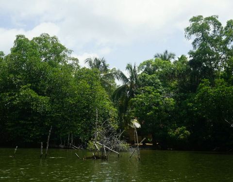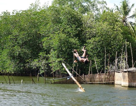 湖面非常宽广,红树林的规模也非常之大,湖的中央散落着几处小岛,随处可见原生态的虾池——木棍围堵的水域,湖中间会有高脚的售卖金椰子的小亭子,偶尔也会遇到欢乐戏水的兰卡青年,湖的南侧与大海相连,接近湖海交界处时,会顿觉心旷神怡、海阔天空。 由于去的时候是中午时分,鸟儿和猴子都躲到了树林深处,只看到了在水里游泳的巨蜥。没有看到其他的动物,清晨和傍晚应该是游览红树林的最佳时间,毕竟动物们也怕热。