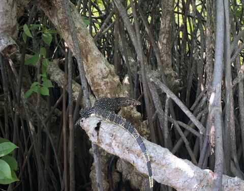 没有看到其他的动物,清晨和傍晚应该是游览红树林的最佳时间,毕竟动物们也怕热湖面非常宽广,红树林的规模也非常之大,湖的中央散落着几处小岛,随处可见原生态的虾池——木棍围堵的水域,湖中间会有高脚的售卖金椰子的小亭子,偶尔也会遇到欢乐戏水的兰卡青年,湖的南侧与大海相连,接近湖...湖面非常宽广,红树林的规模也非常之大,湖的中央散落着几处小岛,随处可见原生态的虾池——木棍围堵的水域,湖中间会有高脚的售卖金椰子的小亭子,偶尔也会遇到欢乐戏水的兰卡青年,湖的南侧与大海相连,接近湖海交界处时,会顿觉心旷神怡、海阔天空。 由于去的时候是中午时分,鸟儿和猴子都躲到了树林深处,只看到了在水里游泳的巨蜥。没有看到其他的动物,清晨和傍晚应该是游览红树林的最佳时间,毕竟动物们也怕热。 展开