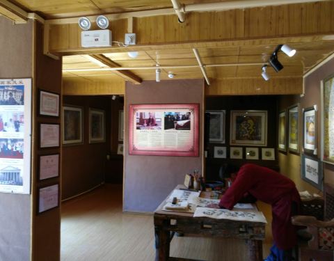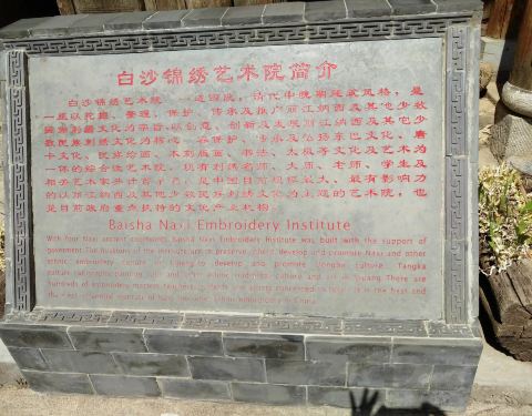 这个艺术院在白沙古镇里的一个小院子,里面有一些文化方面的展示,其中有唐卡展示,还有人在画纳西族的文字,里面还有纳西族的刺绣展示。有一个房间里有当地人在做刺绣,可能是展品,也可能对外卖。
