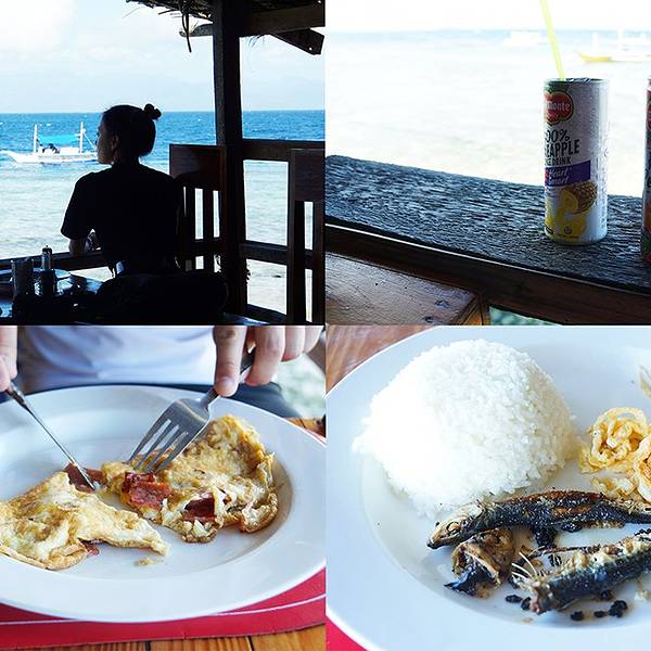 因为在Panagasama Beach海滩游出几米就能见到沙丁鱼风暴,索性也不想报各种深潜或者浮潜的项目了。我们决定把墨宝的第二天过得慢一点。到镇中心购物中心吃当地Brunch。👇超爱他家的薯条,三种口味都好吃。然后逛逛买买,在超市里买芒果干带回国最划算了。下午我们回到酒店的天台晒晒太阳,拍拍照片。之前在奥斯洛布带我们看鲸鲨的向导Abe刚好带客人来墨宝,又见面了,听他聊聊旅途中的趣事。牛肉小姐回房睡了个午觉,直到太阳要落山的时候才被我叫醒。带着浮潜的装备来到Panagasama Beach。竟然偶遇了一只海龟。在水中跟它相遇的感觉真的好奇妙。往外再游出几米就到了大断崖,一大群沙丁鱼真的就在我前面一两米处,非常震撼。虽然光线已经不够好,但是鱼鳞反射的光芒在海底依然美丽动人。日落的速度很快,坐在岸边让海风吹干湿漉漉的我们,看晚霞慢慢变红。👇找到一家名为Lantaw的餐厅,只为它的生鱼片而来。在墨宝的最后一天起了个大早,这次行程最开心的就是每天都是大晴天。趁着早晨明亮的光线又来到海滩边,打算再一次潜进海里看看沙丁鱼群。心满意足,归还了脚蹼和其他装备,慢悠悠地回到了酒店收拾行李。
