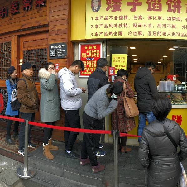 典型的步行街,有点类似于北京的南锣鼓巷~但是我觉得还是南塘老街更好一点。这个派对的人超级多,可惜中午实在吃的太多了,只能看一看啦~貌似辣酱是秘制的呢。这家店叫矮子烧饼,无意间路过看到的。排队的长度至少有20-30人,由于晚上要赶飞机回家啦,来不及尝一尝它的美味了~