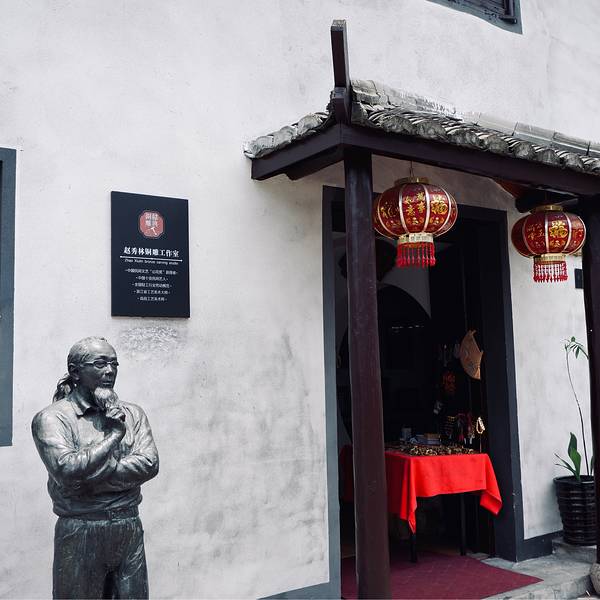 越酿工坊+铜雕馆 我是在一面墙上看到这个点的,原本以为这是一个酿酒工艺作坊,原来并不是…… 📍坐标:书圣故里笔架桥26号(题扇桥过去,躲婆弄出口) 环境:现在他已经变成了一楼卖酒二楼展示的地方了,喜欢他门口的那一个大缸,很有家里面酿酒得时候的感觉。 尽管这里这个大缸是用来装饰用的,屋子外面都是各种空置的酒坛子,酒香文化气息扑面而来,可见卖出了好多酒,这些酒坛子都是需要用的时候用,不用的时候就这么堆放着的。 在越酿工坊的对面,就是铜雕馆 他们都在这条叫笔架桥的躲婆弄里面,算是东边的口子处,在书圣故里景区中间地带吧。 这家铜雕馆不是单纯的展出展馆 他集合了展出与销售一体的格局 让你一饱眼福的同时也可以带回一些小装饰物回去把玩。 门口有一个赵秀林的铜像,他是山花奖的得主,高级工艺美术师,获奖很多,可以在这里欣赏铜雕作品。
