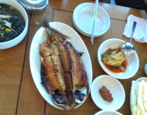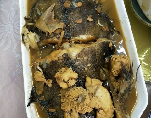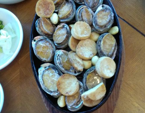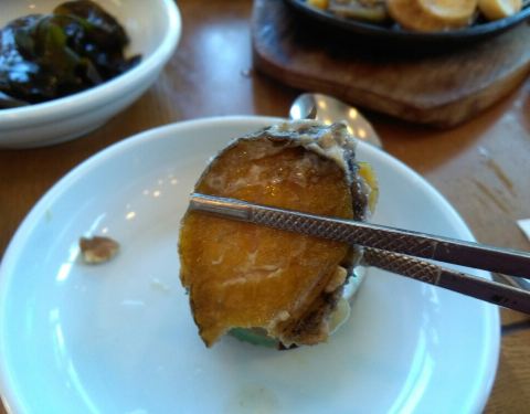 烤鲍鱼拌蘑菇香蒜点点的黄油味道相间也有大餐味道花青鱼也是烤的更好吃没有刺香香脆脆的~不说了我要开动了