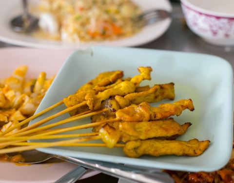 - 正盛门外还有一个烤沙爹的小摊档,也点了一份尝尝,烤串味道很正宗。一般饭点来会有排队的情况