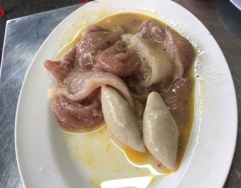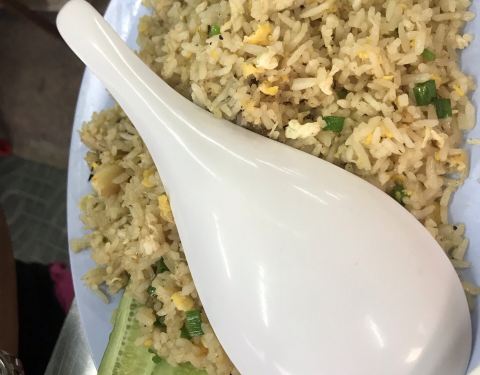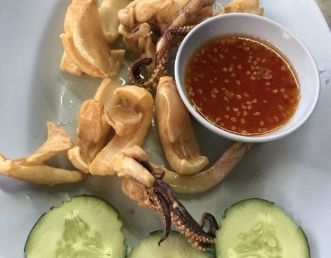 正盛食堂是华欣的一家泰式餐厅,在当地很有名气。一般饭点来会有排队的情况。 这家店面其实并不起眼,装修也很老式,但是因为这里的菜品味道好,价格实惠,在当地人和游客眼中,都有着很高的评价。门口有一块中文招牌,这样的老店给我的感觉倒像是华人后代开的一样。 和朋友们提前了时间过来吃午餐,餐厅已经没多少座位了。墙上写有菜品种类和价格,客人可以自己选择。泰式奶茶是必点的;油炸的鱼丸,肉质Q弹,配上泰式酱料,口感很好;辣炒的扇贝,分量很足,扇贝也都是大个又新鲜的;主食点了海鲜炒饭,炒饭里有鱿鱼,鸡蛋,蟹肉和虾,分量足,建议两人一份;螃蟹是他们家的特色,都是去掉了壳和鸡蛋辣椒一起炒,这道菜是我的最爱;鱿鱼里面加有咸蛋黄,我不是很喜欢这样的口味,但是这道菜当地人很喜欢吃;豆腐丸子白菜汤,这几天才泰国好几顿都有吃到这个菜,鸡蛋豆腐配上肉丸,汤味清淡;正盛门外还有一个烤沙爹的小摊档,也点了一份尝尝,烤串味道很正宗。如果你到华欣来旅游,建议一定要来试一下这家正盛食堂。