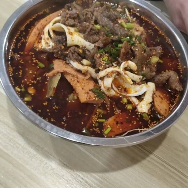 来万达这边买点生活用品,左思右想不知道吃啥,就打开了点评。看他家推荐还不错,也是个老店了。巷子里的店来说,装修的很干净了。点了牛肉、午餐肉和一份素菜。上来的量真的震惊我了,一盆这一人能吃了吗?味道真...