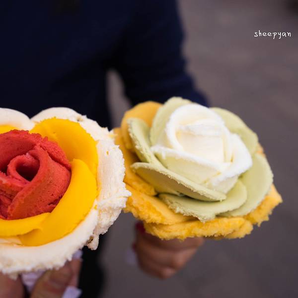 - 冰淇淋的特别之处是逼真的玫瑰花造型,一点点创新就能有竞争力。果然网红店,门口排着长队,大部分是游客
