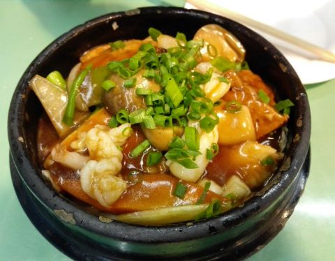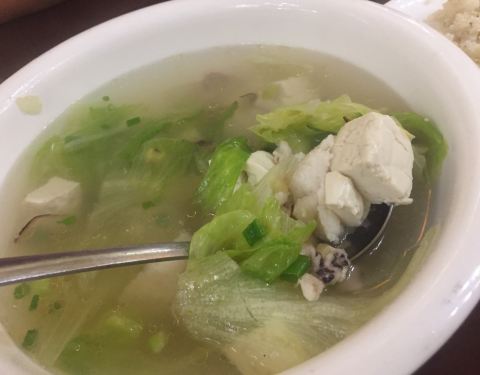 韩国人来这里吃的比较多,一餐饭居然有好几桌韩国人,相对于隔壁另一家中餐厅,这家面积大很多,但是却少了家乡的味道,也就是说这只能是中餐馆,但距离粤菜实在有点差距,不知道是不是点的菜不对,海鲜豆腐汤,里面青菜居然是西式的包生菜而不是青菜,清汤加点鱿鱼丝花甲煮成,丝毫没有海鲜汤的鲜味,还放了麻油,只喝到麻油口味,这是北方的汤么?估计适合北方胃口吧,老广人实在不习惯,蒜蓉开边虾虾肉没有融合蒜蓉的味,只能说过得去,虾肉口感还算新鲜,炒饭就惨不忍睹了,一坨坨的,偶尔两个虾仁,感觉像虾仁拌饭。除了通菜比较嫩口味还过得去,不知道点菜不对还是怎样的,反正真不好吃,两个人就这样的菜人均也要300,快餐的品质这样的价格也实属不易。
