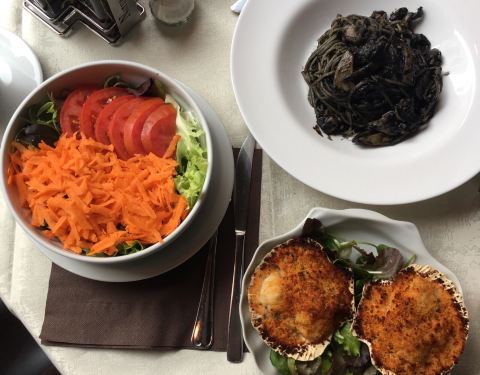 ...,吃的很饱,我们一共点了墨鱼饭墨鱼面,意大利面和千层面还有烤土豆,每一个都是我们吃过的最好吃的