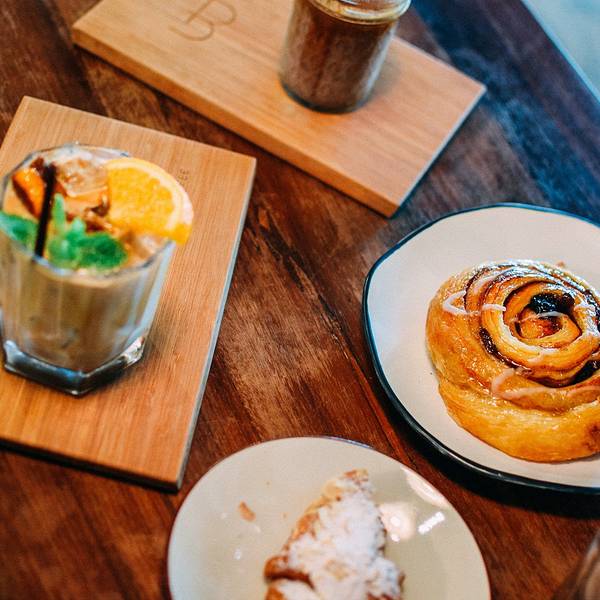 我们互相交换试了试 真的好喜欢!第一杯的口感非常浓郁丰富 肉桂的香气混合着咖啡的味道 后味中还有橙子的水果甜 交织在一起特别合适夏天;第二杯甜度会稍有一点多 对于我这个喝咖啡不加糖的人来说啦 阿敏就觉得很合适 而且越喝巧克力的口感会越来越重因为没有吃早餐直接过来的 所以点了一个杏仁可颂和肉桂卷(我真是迷之喜欢肉桂啊)