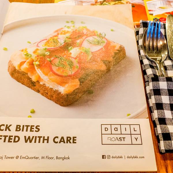 🏠环境:虽说Roast身处EmQuartier商场,却丝毫没有空间上的压抑。清爽的门面不用多说,cafe控一定非常熟悉,大片的落地玻璃,从商场外面的连廊望过来,仿佛这个转弯就是为它而设计,门面入口一长排座椅,让整家店提升不少档次。找临窗的位置坐下,还可望到商场中间的小花园,杂志式的菜单更彰显不少roast独有的气质,每款菜品甚至饮料都有详尽的介绍,可以说各方面细节做得非常到位。