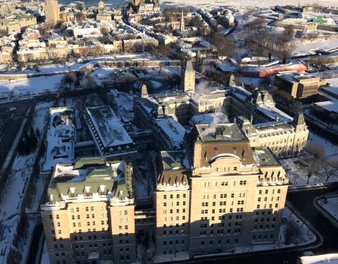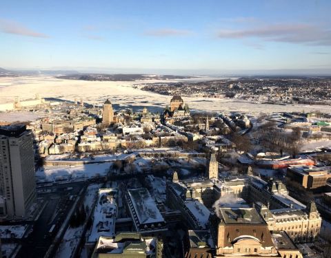 登上蒙特利尔塔—-世界上最倾斜的高塔。万里无云的天际下,难得冬日暖阳高照,视野辽阔,远方的劳伦斯山脉延绵交汇天际,仿佛通往上天之路!