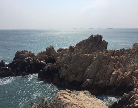 来到蔚山市的大王岩公园观光,海面开阔,怪石嶙峋,有点儿”东临碣石,以观沧海”的意味