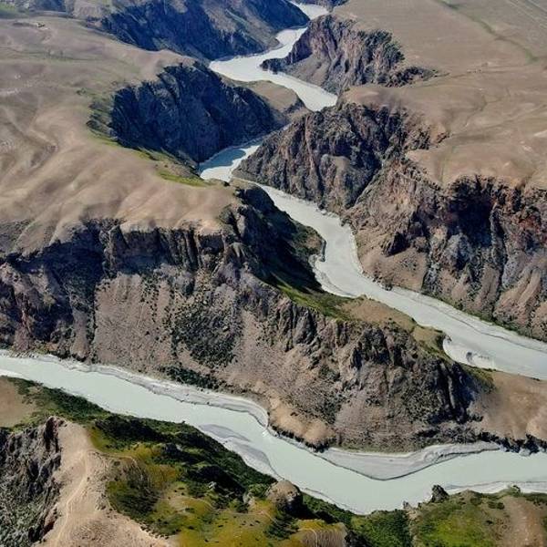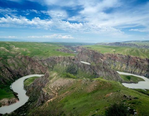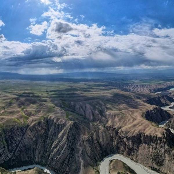 阔克苏大峡谷位于新疆特克斯县。居高俯瞰,绿色草原从谷顶向下蔓延。九曲十八弯的阔克苏河在谷底曲折流转,河水呈乳白、碧绿、翠绿三种颜色,给人以壮丽、秀美之感。周围群山环绕,山峦重叠。峡谷两岸到处可见类...