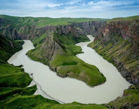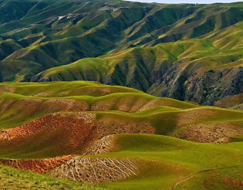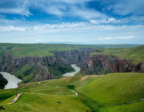 阔克苏大峡谷位于新疆特克斯县。居高俯瞰,绿色草原从谷顶向下蔓延。九曲十八弯的阔克苏河在谷底曲折流转,河水呈乳白、碧绿、翠绿三种颜色,给人以壮丽、秀美之感。周围群山环绕,山峦重叠。峡谷两岸到处可见类似“人体草原”的地貌景观。