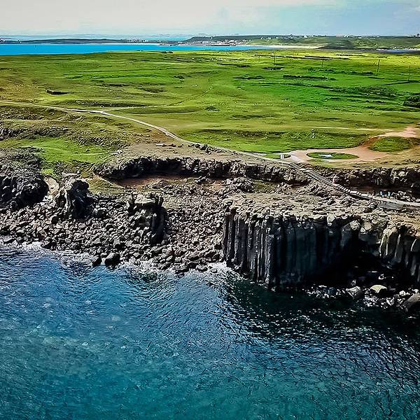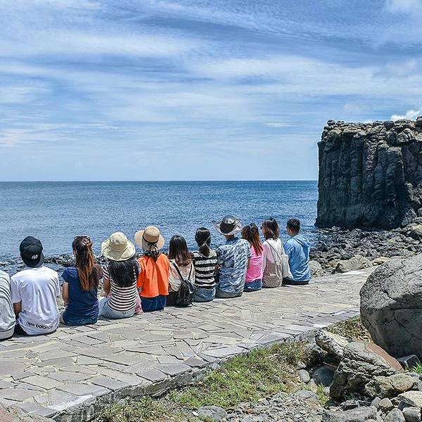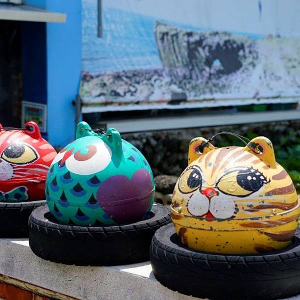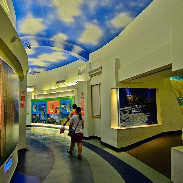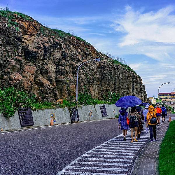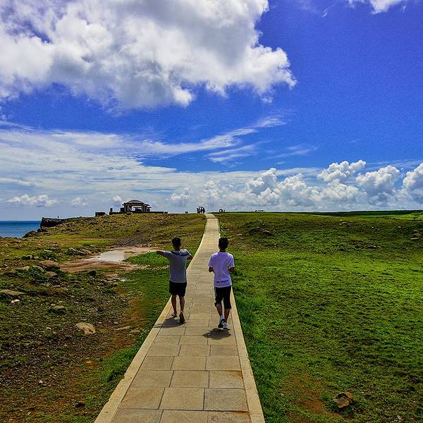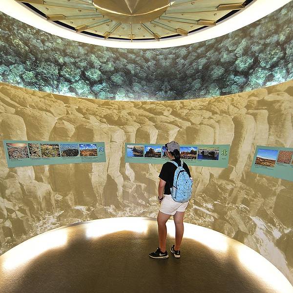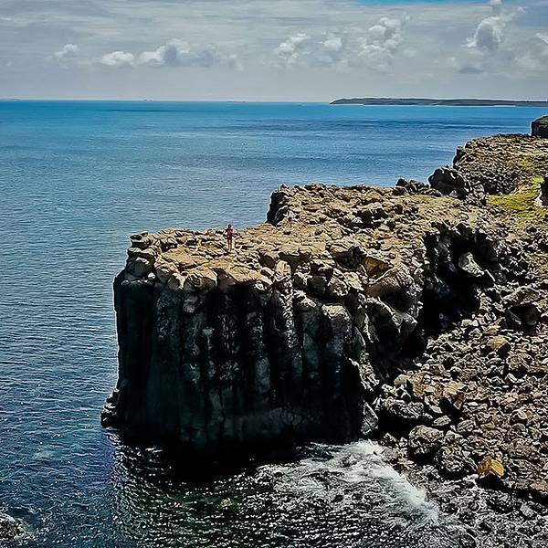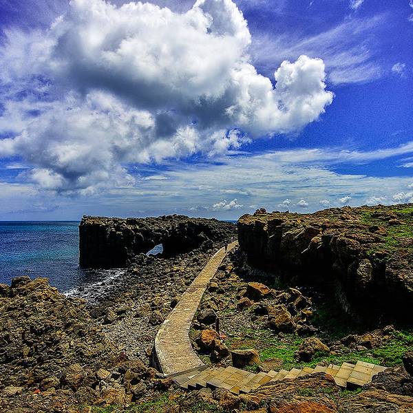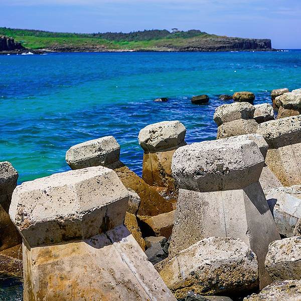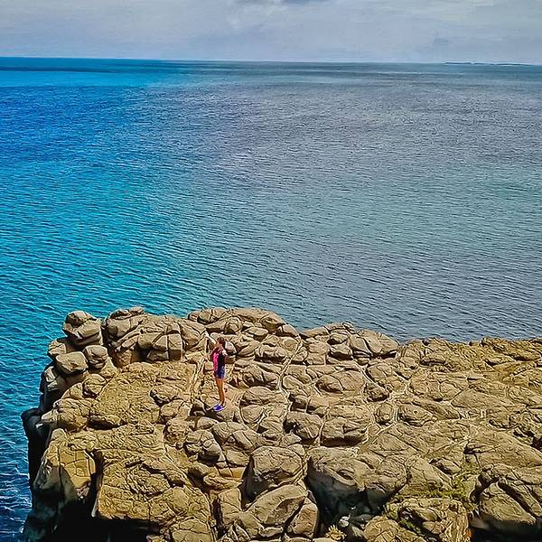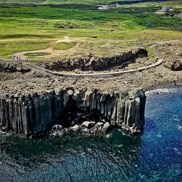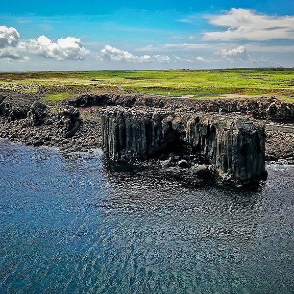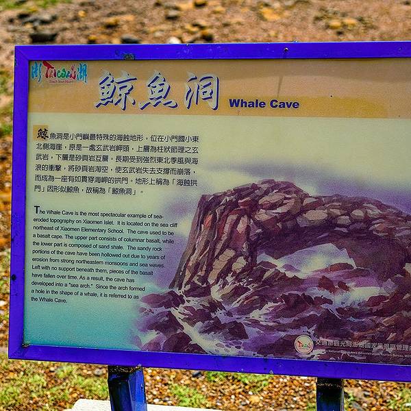经过跨海大桥,我们就来到西屿岛,小门渔港和鲸鱼洞洞是这里非常有名的景点,就在西屿的北部。车辆会停在渔港边的停车场,游人需要步行进入景区,这里的景区都是免费的,包括小门地质馆和小门鲸鱼洞,沿途有路标指示。我们来到小门渔港,这里附近已经可以看到柱状玄武岩节理了,而且很多,很多海岸断崖都露出这种火山熔岩冷却后,形成的地质景观。小门这里除了渔港码头,还有一小片沙滩,也是不错的一个海边浴场,不过这里海浪挺大,在提岸上拍出巨大的水花,说明这里涨潮的海浪推力很大,还是具有一定的风险,如果游泳者被潮汐推的撞到水泥墩上,那就会形象不美了。在海岸边有多道水泥墩子筑成额防波堤,从水泥墩被冲击损坏和倒伏的情况来看,这里如果遇到台风等气候,风浪一定非常巨大,这里已经是澎湖外海海港,所以风浪威力比内港的风浪要强很多。在渔港里,很多捕鱼用的旧浮球,都被装饰成各种造型,很多只都不重样,非常的有趣。穿过渔港后面的村镇,有两条道路,左边的一条通往小门地质馆,右边条通往小门鲸鱼洞,我先去了地质馆进行参观。小门地质馆设计和布局,还有灯光设计都非常不俗,定然是博物馆设计大师的作品,能在一个小渔村看到这样高水平的科技展览馆,还是挺感意外的,展馆里的陈列资料和布局,也非常科学精致,值得一观。在小门地质展览馆里,不仅对于小门地质进行详细说明,还对于澎湖地区类似地质景观进行综述,还引深展示了国际上类似地形情况。因为很多图文资料来自澎湖不同区域,有些区域是游客很难到达的地方,所以这些图片资料,对于完整认识澎湖地质结构和不同区域的差别特点,有很好的科普意义。沿着长长的步道,走通向小门鲸鱼洞,沿途可以看到一些房屋的基座,这里貌似附近曾经建筑过眷村,不过目前只留大片的草地。小门鲸鱼洞是一处处玄武岩中间部分崩坍后形成的石拱,其上层结构是柱状节理玄武岩,下层是砂页岩,因为受到强烈东北季风和海浪的冲击,下层的砂页岩被掏空,使得中间的玄武岩失去支撑而崩落,形成了一座海边石拱门,地质上称为“海触拱门”,因为某些位置看上去像鲸鱼,所以叫做小门鲸鱼洞。步道上有处凉亭,附近有鲸鱼洞拍摄点位置的提示。从这个角度来看,是不是像只鲸鱼的造型呢。如果走到石洞底下,会看到这样的景象,很狰狞恐怖的碎石石拱。因为石拱底下的地质构造不是太稳定,所以是不建议游客走到石拱下方。很多游客愿意爬到石拱的顶上,张开双臂拥抱海风。一般的游客只能从海岸边来看小鲸鱼洞,而空拍机却可以给我们带来不同的视角。从大海这一侧看鲸鱼洞,景色更加壮丽,你会发现附近的柱状节理玄武岩区域很大,附近整片区域都是这样的地质构造。而且从高空看水下,会发现水下部分还有更多的柱状节理堆积,水下堆叠了大量节理碎石。从外侧看来,小鲸鱼石拱的外立面的石柱更完整清晰。小门鲸鱼洞附近,东侧有一个处高台,可以从这里远望到跨海大桥的雄伟身姿。