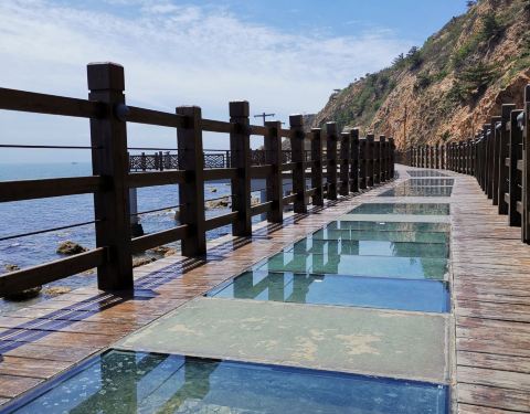 长山尾位于林海公国内,从玻璃栈道下到海滩,沿海滩行至长山尾。在长山尾可近距感受渤海与黄海的交汇,在山头渤黄海分界碑远望渤黄海分界后,再近距感受一下就完美了。