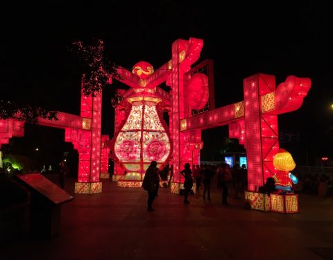 偶遇“梅兰竹菊”四个颇有特点又各自独立的灯座。从它们中间穿过,便来到一座小桥,桥上有栩栩如生的小石狮,每隔一米左右布置四个一串的红灯笼,很有古韵风情。路人老者携手妻子,一边欣喜介绍:“这小桥流水红灯笼,颇有秦淮河的韵味!”