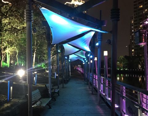 夜晚灯光将公园和苏州河点缀的非常美。 公园不大不小,绿色植被覆盖面广,亭子栈桥雕塑,也很幽静公园就建在苏州河边,河对岸就是中远两湾城社区。 公园不大不小,绿色植被覆盖面广,亭子栈桥雕塑,也很幽静。 夜晚灯光将公园和苏州河点缀的非常美。 晚上散步和夜跑的人也非常多。
