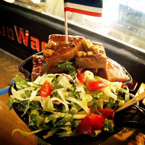 老板人很好,为我们讲解刻版画的制作方式,而且有问必答,问了下价格一张10元,小余砍价说15元2张,老板说行。后来是...罗记旁边的一条小食街【沙拉牛排杯果汁】
