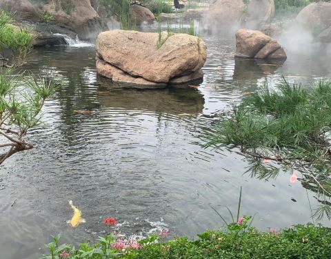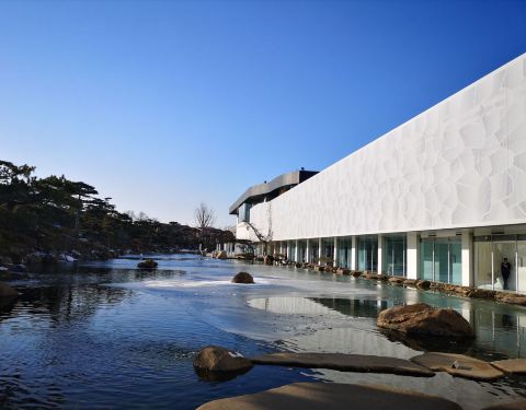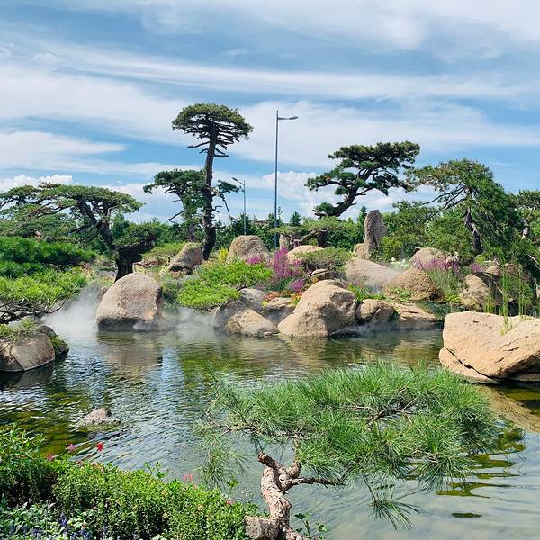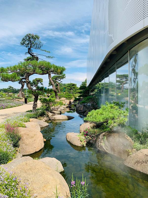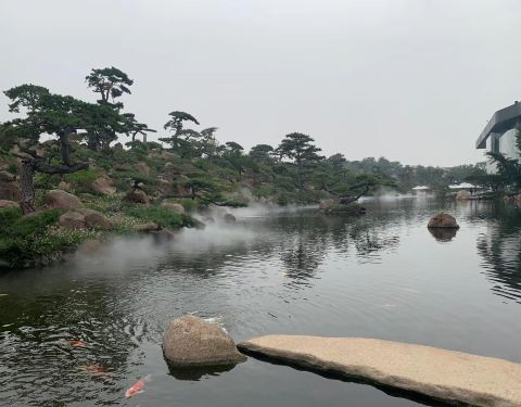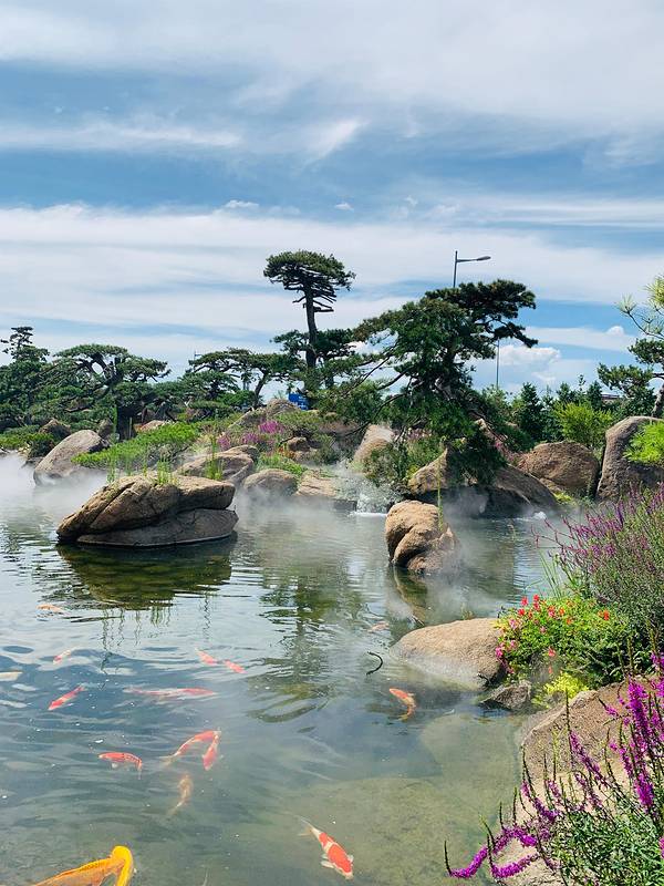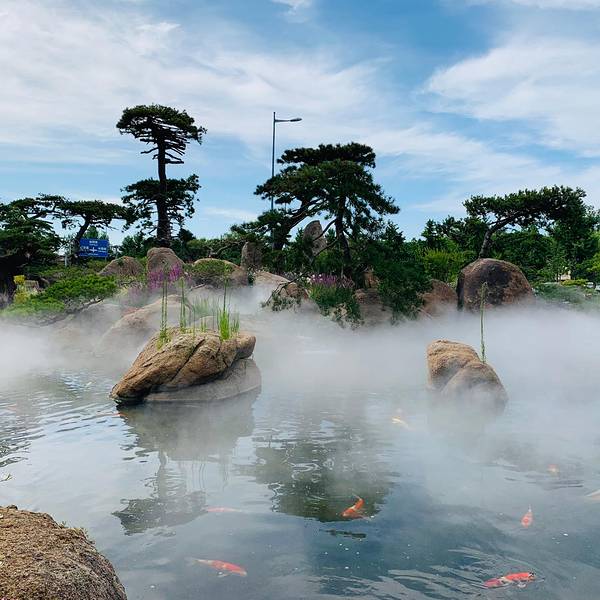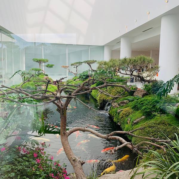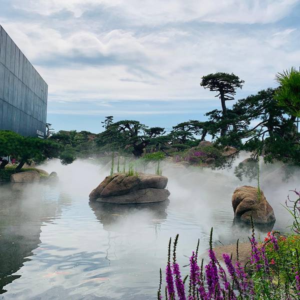 现代的艺术展馆,搭配着极具有东方韵味的松柏,水中畅游的锦鲤,湖面上的氤氲的雾气,营造出仙境一般的感觉