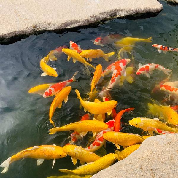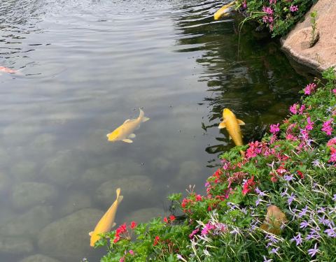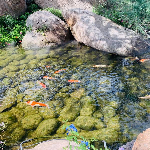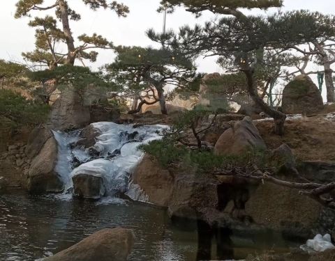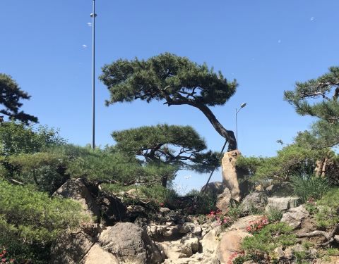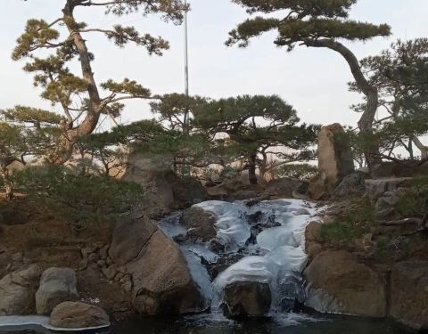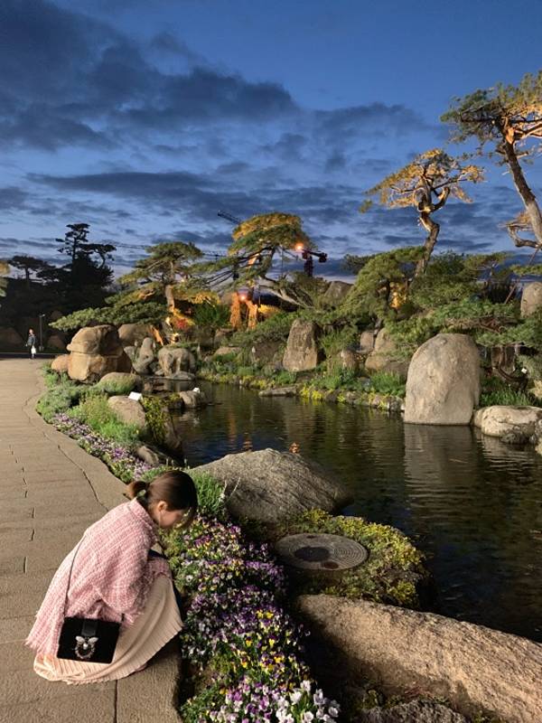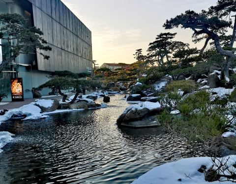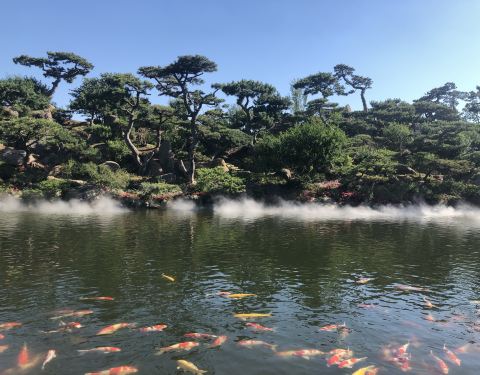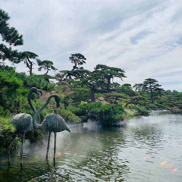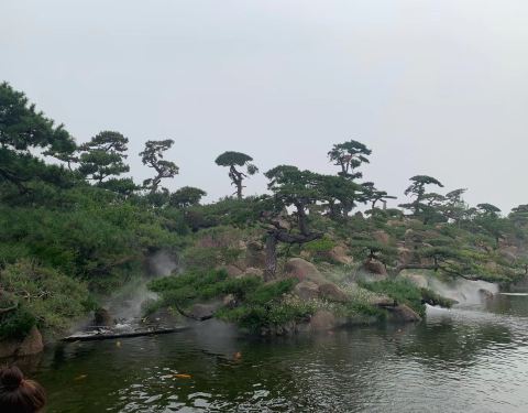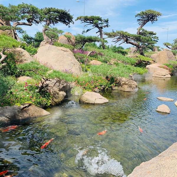 现代的艺术展馆,搭配着极具有东方韵味的松柏,水中畅游的锦鲤,湖面上的氤氲的雾气,营造出仙境一般的感觉