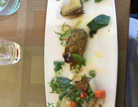 The view is as great as the food! Fresh and beautiful try the vegetarian starter with zucchini flowers and artichoke.