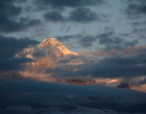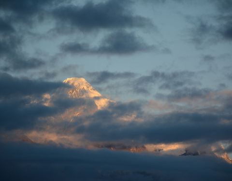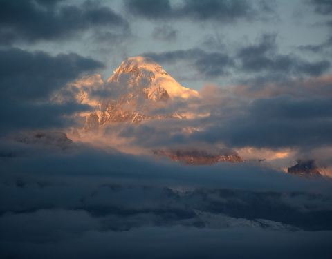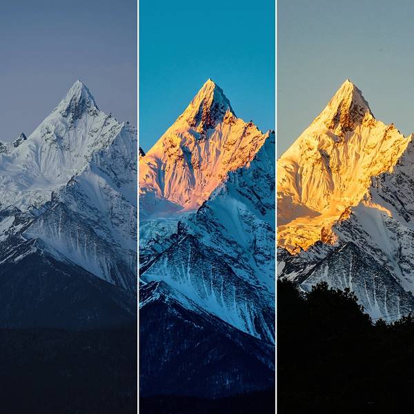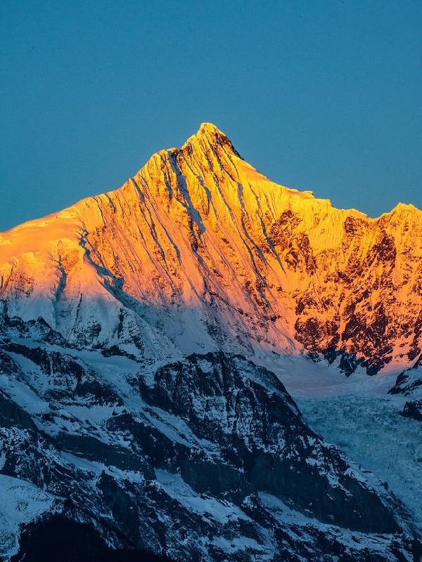 瞬间,数十座雪峰全披上一层金灿灿的夺目光芒,光芒万丈,瑰丽辉煌,这就是著名的“日照金山”