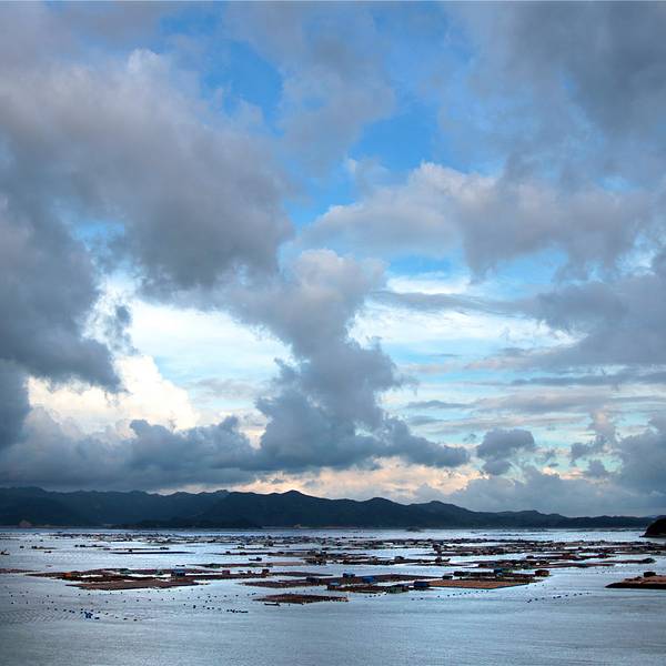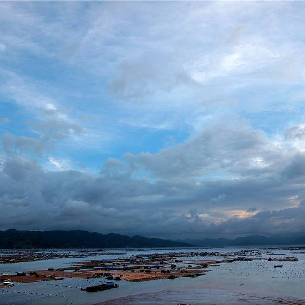 到东安鱼排,想看全景,那是肯定要登上高处才能看到的。司机安排了小艇带到东安小岛。登顶,果然壮观,逆光下的小船。远处的村庄,都已变成几层楼高的小洋房了。极目四看,大小渔排铺满海面。这里地处霞浦县的东吾洋,是三都港内一个狭长条形港湾,形似葫芦。四周群山环抱,地理位置可说得天独厚,能够很好的挡避风浪,所以非常适合海上养殖。北方有些乌云,飘些小雨,这环境如果雨势够大些,落日光线够强,那就妥妥的会出现彩虹,可惜没有。这些云快速向南移动,越来越多,越多越厚,最终把蓝天与夕阳掩盖了,与落日无缘。滩涂与船家巡排海上威尼斯 展开