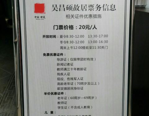 只是故居门票20元和故居呈现的参观内容相比,性价比不高吴昌硕故居所在的村镇,收拾得很干净,一条商业街,两边的店铺人气不足,主要是做折扇,安吉的竹子做折扇的骨架,小作坊加店铺,同时也是居住的家。 吴昌硕故居属于冷门的景点,没有其他游客,也能宽容我们的狗...吴昌硕故居所在的村镇,收拾得很干净,一条商业街,两边的店铺人气不足,主要是做折扇,安吉的竹子做折扇的骨架,小作坊加店铺,同时也是居住的家。 吴昌硕故居属于冷门的景点,没有其他游客,也能宽容我们的狗狗进去,这就等于一家人包场参观,感受还是可以的。 只是故居门票20元和故居呈现的参观内容相比,性价比不高。逛一圈,半个小时就够了。 展开