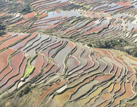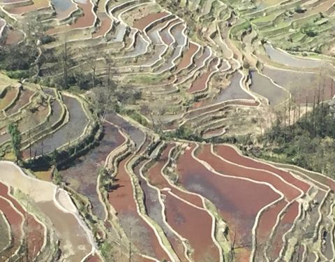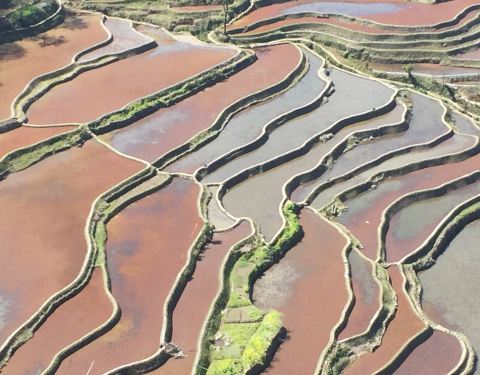 老鹰嘴则是新近发现的好景观,它不需要门票,展现的是红色梯田,那是红色浮藻飘在梯田水面