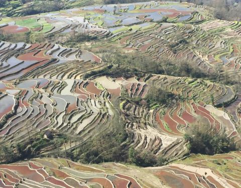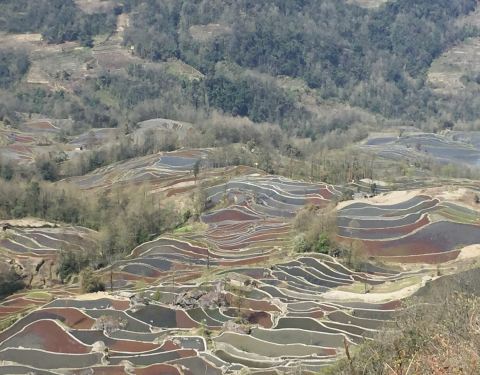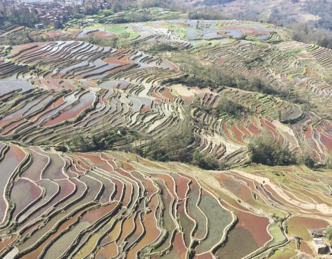 老鹰嘴梯田的部分梯田水面长着枣红色的浮藻,故名红色梯田,而另一部分没长浮藻的梯田在白天显蓝色,我觉得是一片多彩的梯田。这也是观看日落的好地方,日落时梯田色彩更加绚丽。