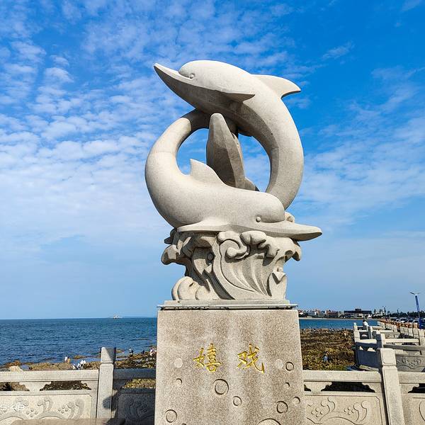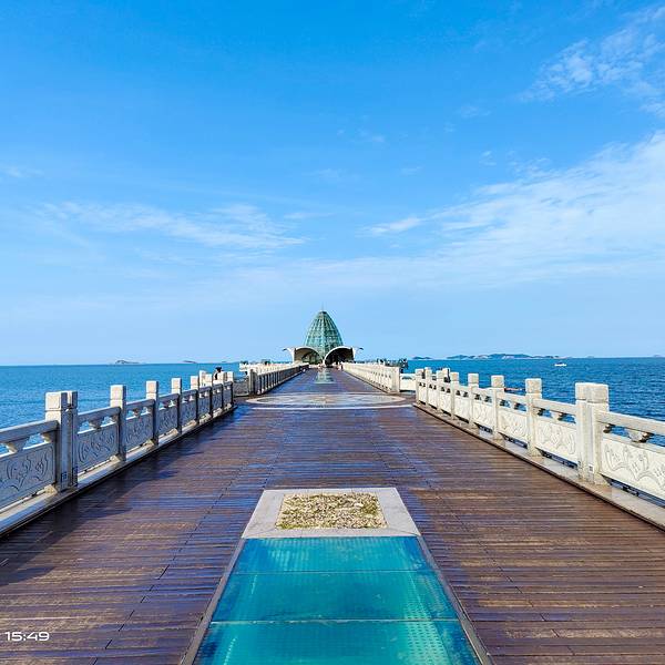 位于烟台市芝罘区东部,东炮台公园南侧,栈桥长600多米,桥的尽头有一个亭子,四周都是海水。或坐或立亭边,或依或扶栏杆,蔚蓝的大海上,海鸥在飞,海水冲击着脚下的水泥柱子激起雪白的浪花,自己周身没有了人世的尘。桥的中间由透明玻璃铺就,走在上面往下看,海水在涌动。这里是清晨看日出的绝佳地点,但日出不如“海上升明月”令人陶醉。有人说,它是恬静、安详的,那或许是没见风起浪涌时它的屹然;有人说,它是刚毅、顽强的,那或许是没见晨曦晚霞中淡淡薄雾拥裹时的娇羞。我只说它是超脱尘俗的,一尘不染的,刚柔之中无不透出纯净雅致的品质。