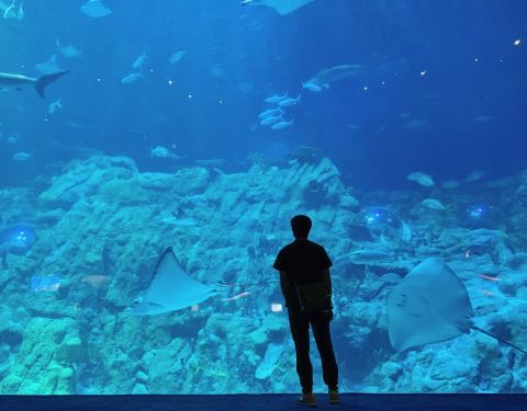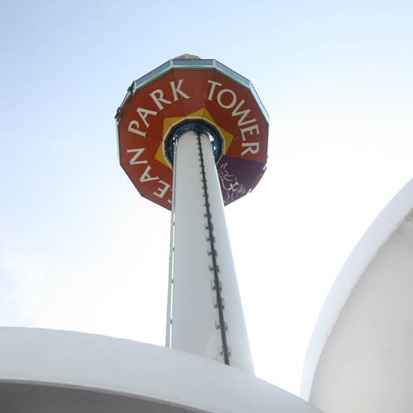 海洋摩天塔的柱子细细高高,却结实。游客在塔底的座位上坐定,沿着柱子缓缓上升、旋转,隔着玻璃窗,会看见自己脚下的世界越来越小,可从新的角度俯视海洋公园。