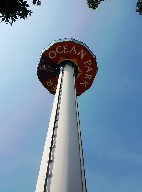 香港海洋公园内的观光塔,高70多米,坐在里面,可以360℃的旋转,可以看到远处的不同风景,旋转的速度不快,所以不必担心会眩晕,这是一个老少皆宜的游乐项目。