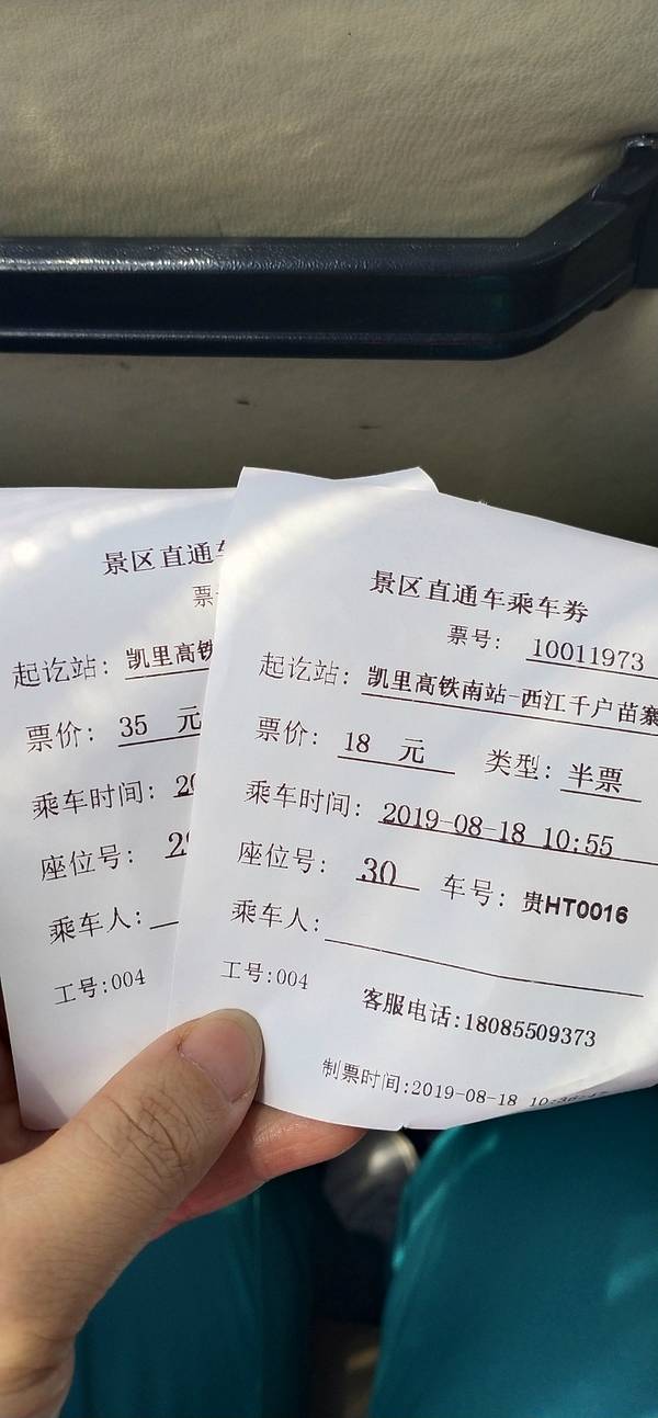 很快就到了凯里南站,之前不敢买凯里回贵阳的高铁,因为担心时间不好把握,但到了这里发现凯里南站到西江千户苗寨景区的旅游直通车半小时发一班,车站就在高铁站旁,非常方便。就先把明天回贵阳的高铁票买取了,省去明天赶高铁的匆忙。凯里欢迎您!凯里客运站,直达西江千户苗寨的车就在这里坐,出高铁站右转步行2分钟抵达。从凯里南到西江还要坐一个多小时的大巴车才能抵达景区,有了景区直通车真是方便多了。之前看到网上说凯里南到西江的大巴车票好像是65一个人,但没提前买,到这里买菜35的成人票,18的半价儿童票,很划算、很方便。每台大巴车上都配有官方的讲解员,能大致给旅客讲一下西江苗寨的历史、民俗,他们也代售去各个旅游景点的车票、还有西江歌舞表演的门票、长桌宴等等,讲解员小王不错,耐心,也不会强制购买,一切都是自愿,买不买都可以的。1个多小时就到了西江千户苗寨的西门,但我们要去的是北门,这里没人下车,大部分是自驾游的。
