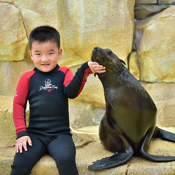 在真正到浅摊互动之前,讲解员带我们到 海豚湾 实验室参观,详细讲解了海豚和海狮饲养的知识,让我...一觉睡到自然醒,美丽的海景尽收眼底吃好早饭直奔 海豚湾海豚浅摊互动要1个半小时的时间,所以我预定的是早上的10:15第一场,这样可以跟海狮拍照连起来完成。换好 海豚湾 提供的潜水服,我们开始接受培训。真的是V...一觉睡到自然醒,美丽的海景尽收眼底吃好早饭直奔 海豚湾海豚浅摊互动要1个半小时的时间,所以我预定的是早上的10:15第一场,这样可以跟海狮拍照连起来完成。换好 海豚湾 提供的潜水服,我们开始接受培训。真的是VIP待遇,一个美女接待+一个驯养员+一个讲解员的组合在真正到浅摊互动之前,讲解员带我们到 海豚湾 实验室参观,详细讲解了海豚和海狮饲养的知识,让我们离这些小可爱们 又近了一步 ,下面开始互动啦近一个小时的时间,我们跟小海豚握手,亲吻他,抚摸他,与他戏水,不得不说,海豚的智商真的很高,与我们很快打成一片整个互动都是在驯养员的指导下完成的,海豚浅摊互动要注意的是不能再水中跳动,不能半途退场,中途退场他们会失落的哦最后他还以他独特的方式跟我们道别海狮拍照时间很短,大概10分钟左右,我记得这个小美女好像叫“小高”海豚和海狮需要用多春鱼 来安 慰,我家东哥也需要冰激凌安慰 ,亚特兰蒂斯的冰激凌真心贵,两个球48元,吃的我肉疼海豚浅摊互动的项目每个人有一张纸质版的照片赠送,我们选择买下所有的底片,1088元可以挑选8张照片制作精美相册,互动过程的所有底片会被备份在特制的优盘里。个人认为,对于孩子来说,这些都是最珍贵的回忆