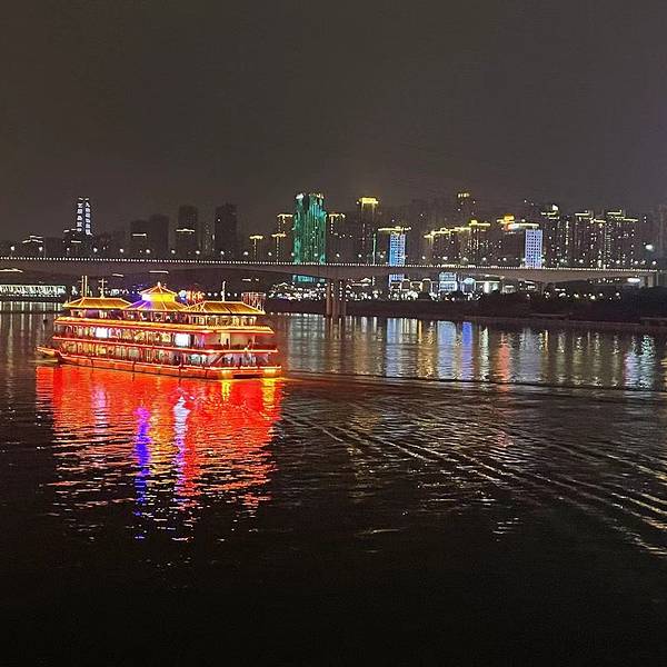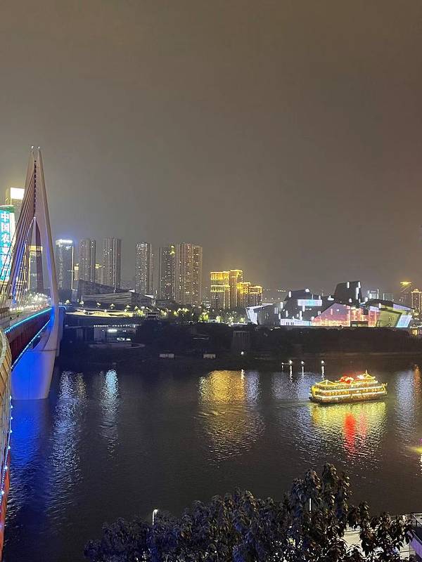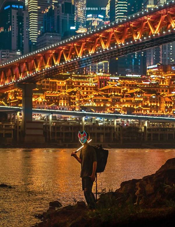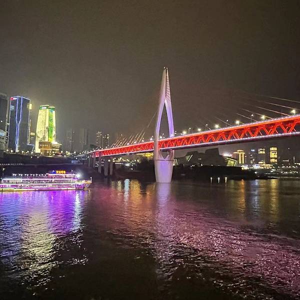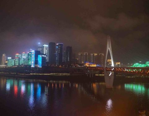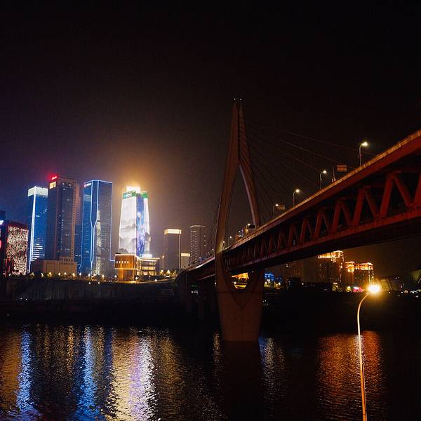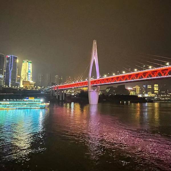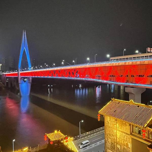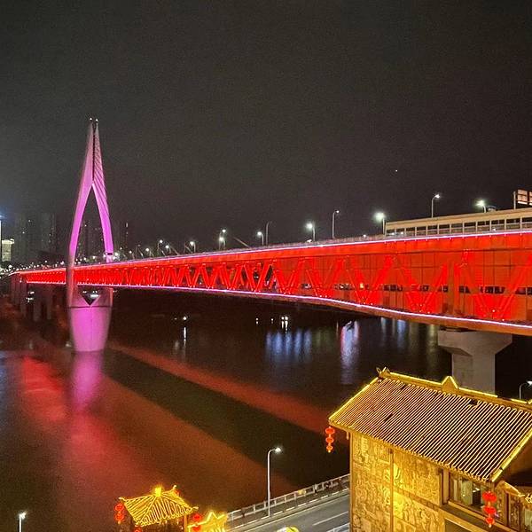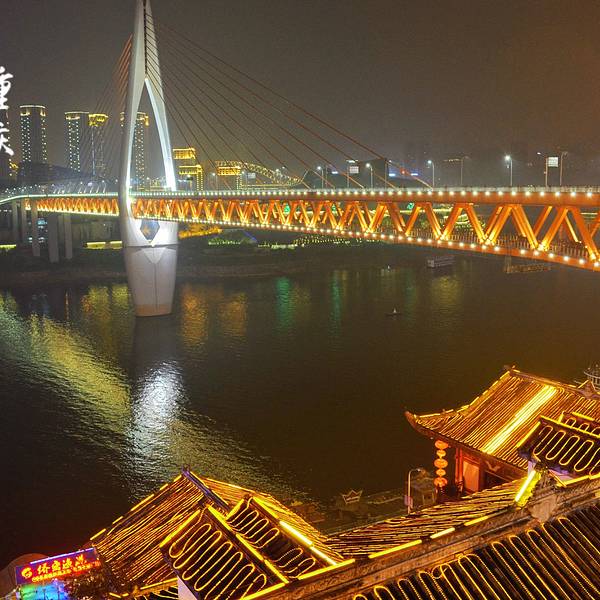 在霓虹闪烁的变幻灯光照射下,夜色中的千厮门大桥似一条红色的巨龙,横架在江面上,气势逼人。站在桥上俯瞰洪崖洞,洪崖洞整个建筑就像从动漫里走出来,跟《千与千寻》中的“不可思议之镇”极为相像,夜景非常美。