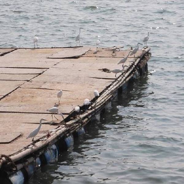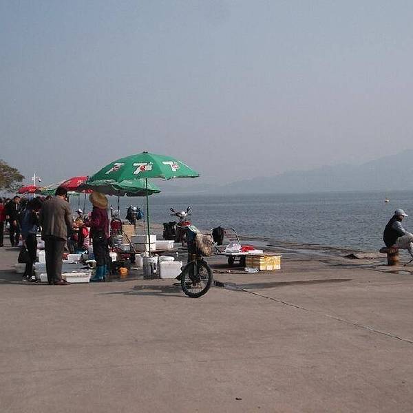 白天渔民在这里摆摊,许多垂钓者等待着鱼儿上钩,还有游客前来购买渔货观赏风景,更多健身者在跑步锻炼身体
