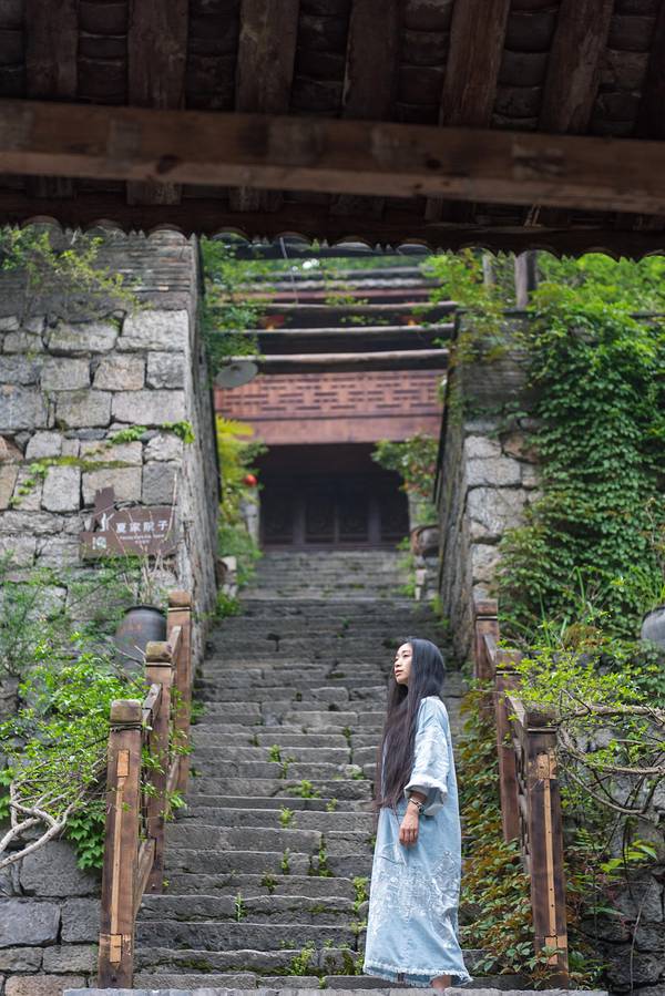 不知不觉,来到了夏家院子的脚下,夏家在龚滩也是颇有影响力的一个家族。尤让我给她在这里拍张照片。这次有她同行,真是件开心的事,不但是因为我有了可以拍摄的对象,而且她会主动给我拍照,避免了我经常遇到的尴尬——出去玩半个月,结果一张自己的照片都没有……话说夏家院子的夏家人起祖江西,时避战乱,举家百余口翻山越岭栖居龚滩距今四百余年,一层层一块块的青石院墙是龚滩保存完好的一家。这个院子的风水极好,背依山崖,直接享受古黄葛树的庇护。一条美丽的乌江从面前流过,举目远望,满目画廊万卷。"夏家院子出美人"一语道出夏家是大户人家。因他家也经营盐业,所以女眷衣着鲜丽,文化熏陶下又落落大方,气质出众,进而得到美人称号。当然,我们的美人尤也不遑多让。