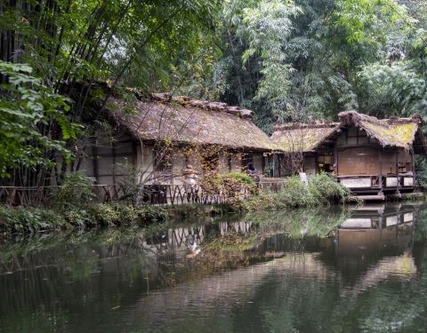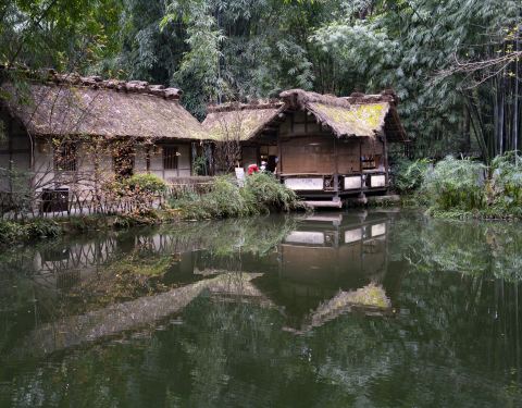 ...典型的,位于草堂的中心,小桥流水、竹林树丛中的一个黄泥土墙、茅草屋顶的小院,典型的川西民居古风
