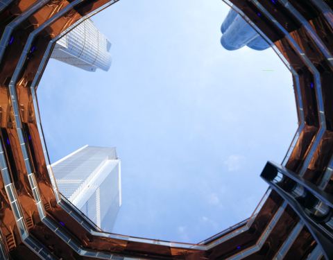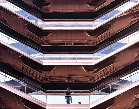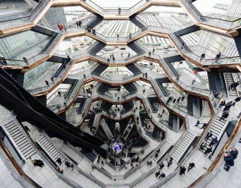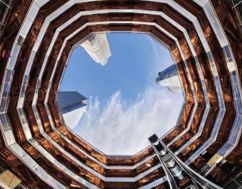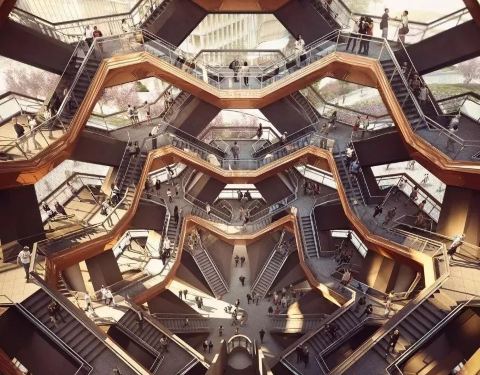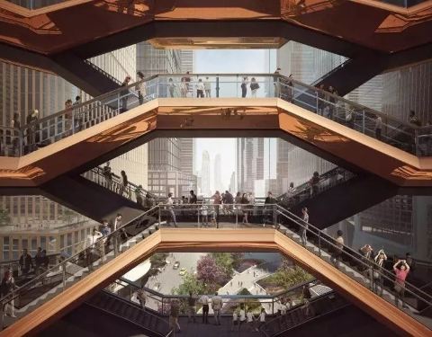 Vessel在哈德逊广场旁,被称为“纽约的埃菲尔铁塔”,由获得2016年设计终身成就奖的英国鬼才设计师托马斯·赫斯维克设计,耗资1.5亿美元。灵感源自蜂窝,该建筑主体全部由按几何点阵排列的楼梯组成,看上去就像永远没有尽头,8层重叠交织、连接互通的钢铸楼梯和平台,近2,500个台阶,近150英尺高。