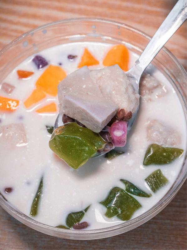 🕌奔着炒湿粉去的,没想到芋头更得我心!! 可以列为目前我在海口吃过蕞好吃的芋头了!! · 👍推荐以下菜品 🔴「椰奶红豆芋圆斑斓冻」12💰 点了这个甜品,但是看上了阿姨家的芋头 可是这个里面没有,于是跟阿姨讨要了几块 芋头真很酥很软烂,荔浦的大芋头口感超细腻 斑斓冻对我而言稍微偏甜了一些,味道不算重 阿姨一口咬定是老椰奶+牛奶榨的汁,但我没喝出来 · 总得来说我非常非常喜欢这家芋头,封神榜!! 炒湿粉很丰富,15元,一堆配料,也可以试试看 · 🔴店名:衡姐甜品 🔴地址:海府一横路和青年路交界国星一号商铺 🔴时间:10:00 - 02:00