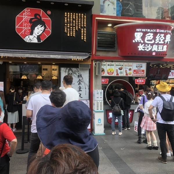 来不及了,打车吧,啊车子打不到。没有吃饱,五一广场的茶颜悦色和黑色经典竟然在一起,刚刚好。一人排一边
