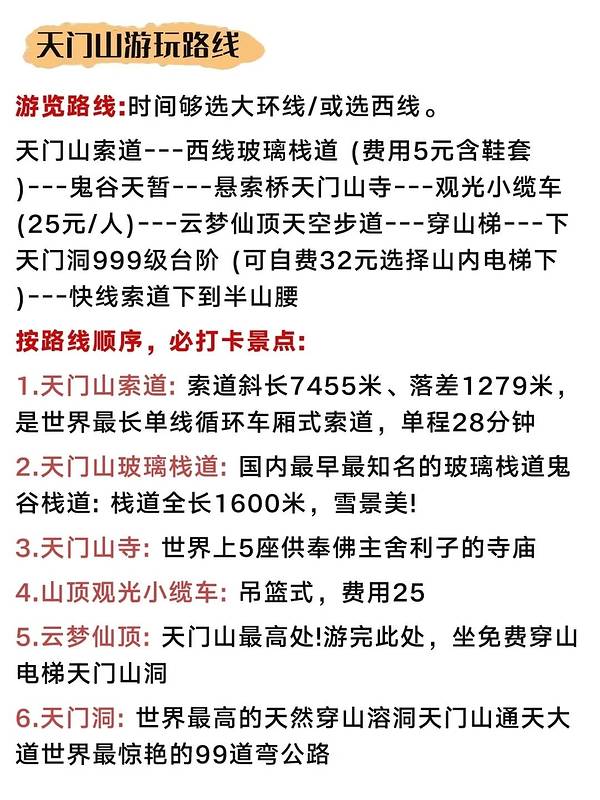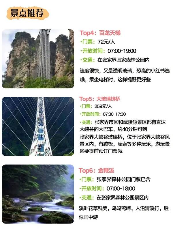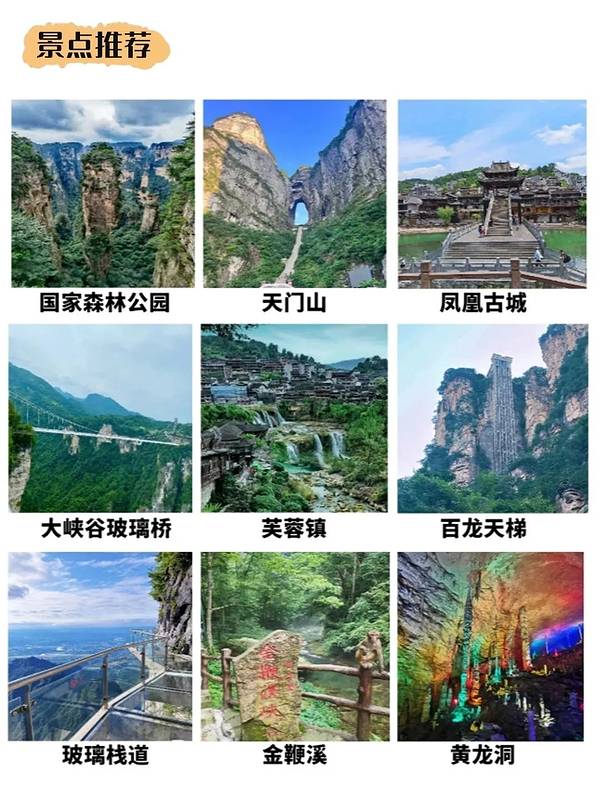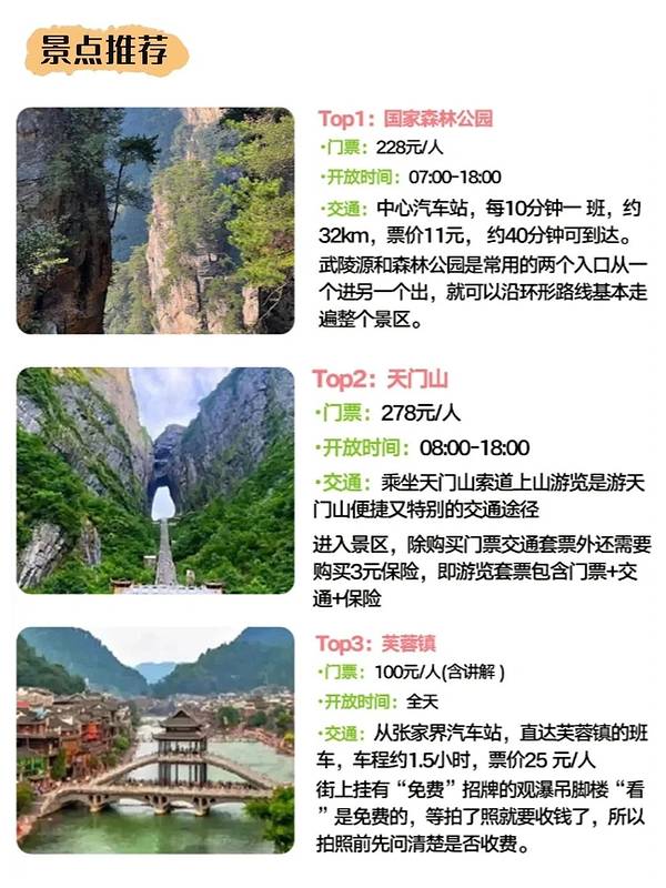 张家界旅行攻略🚥臻享版✅只管冲🧐|||#||张家界旅行攻略🚥臻享版✅只管冲🧐|||#浪漫生活的记录者[话题]# 抄作业!第一次来张家界!逛吃旅游!!! 😫刚和姐妹从张家界回来,尽管我们做了攻略 😡但还是准备不充分,踩了不少坑 😥想去张家界的姐妹看看我们的游后攻略,希望对大家都有帮助来张家界要提前知道‼️ - ✅张家界交通出行 🚌公交车:票价2元,一般晚上9:00之后公交车就很少了 🚕出租车:白天起步价6元,晚上起步价7元 🚗网约车:认准正规的平台,比如滴滴出行、曹操出行、T3等 🏍摩的:张家界市区会有一些跑摩的的师傅,价格比出租车便宜 🚎景点专车:想去景点的朋友,可以在张家界南站汽车站乘坐景点专线 - 🌠前往张家界 ✈张家界荷花机场:距离市区约10公里,打车或者4路公交,约15分钟 🚅张家界西站:距离市区12公里约15分钟(现在大部分火车都在西站上下车)公交车有4路6路17路等 🚞张家界站:现在还有几趟火车停靠,距离市区4公里约6分钟,公交车有1路6路8路10路 - 🛑注意事项 ①拍照的时候抓紧手机📱,张家界的山下什么型号的手机都有 ②景点里买东西划不来,可以自己带一点吃的 ③学生证、军官证等能优惠门票的证件要带上 ④车站/机场附近的黑车别坐,滴滴就行了 - 🎉 游玩路线推荐 📍Day1: 到达-张家界,入住酒店,自由活动(品尝当地美食三下锅,打鼓皮,小龙虾等) 📍Day2: 张家界国家森林公园~袁家界~杨家界(天然长城)~黄石寨 📍Day3: 张家界国家森林公园 金鞭溪 十里画廊 📍Day4: 天门山国家森林公园~索道~玻璃栈道~天门洞~天门山寺等 - 🌈跟着路线打卡景点 📍张家界国家森林公园 张家界的招牌景点,在这里随时可以看到小猴子🐒,不要去招惹它们哦,以防抓伤 📍天门山国家森林公园 爬上99级天梯,体验紧张刺激的天门山索道和悬崖玻璃栈道😱 📍凤凰古城 可以去感受古城古色的苗族风情,夜景超好看,非常适合小姐姐穿苗服打卡拍照📸 - 🗺出行建议: 建议找个当地的纯玩小团,行程轻松!自由!同行人数多,还可以一行独立用车,独立导游服务!不用操心景区门票和酒店住宿!都安排的妥妥的!